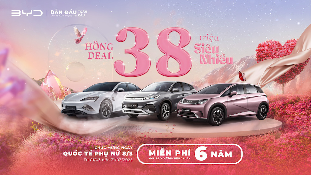 Chào tháng 3, Công ty TNHH Ô tô BYD Việt Nam triển khai chương trình Tri ân khách hàng “Hồng Deal - 38 triệu siêu nhiều” dành cho tất cả khách hàng mua xe năng lượng mới của BYD.